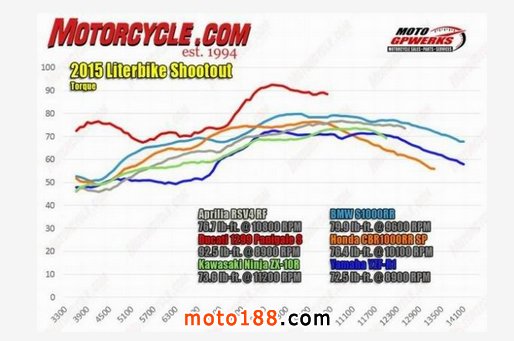 一點也不驚訝于杜卡迪能在峰值扭矩領先,畢竟它的排量更大并且是雙缸引擎。四缸車中的寶馬和本田的中段不錯,但是雅馬哈的表現就略讓人失望。