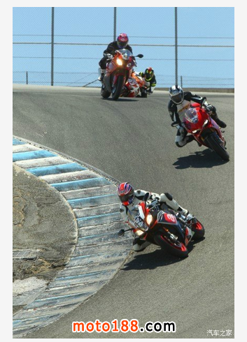 CBR 76.4 lb.-ft.的扭矩比雅馬哈和川崎都要大(它倆分別為73.6lb.-ft.和 72.5 lb.-ft),幾乎和阿普利亞(76.7lb.-ft.)差不多,比寶馬(79.9 lb.-ft.)比也只是稍微弱一點。在賽道的許多地方,尤其是下坡后接連的2、3、4彎道(直線段很少),CBR的表現都非常棒。但是一到大直道,隨著轉速上升,本田馬力小的劣勢便顯露了出來。