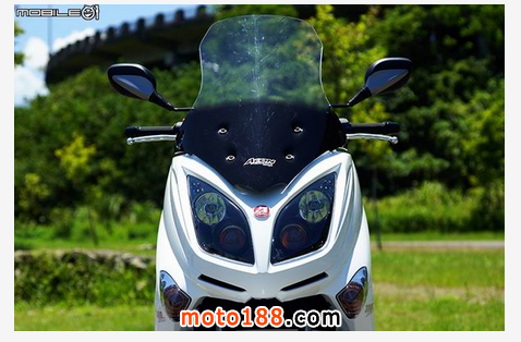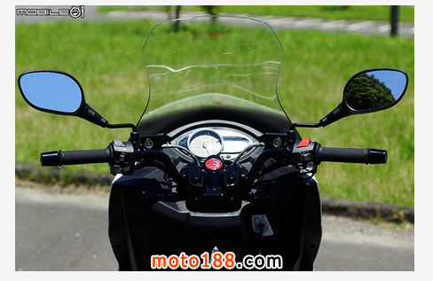 車手視角部分,風鏡占據大多數的視野,但透命的風鏡加上材質較為優良,這張可以很明顯看出在風鏡邊緣切線部分并沒有像有些車款容易有變型,另外對于 Elite 車系吸引人的一點,就是裸露的把手,許多購買大羊車款卻不喜歡原廠把手蓋的車主,通常都會另尋改裝方式,而 Elite 300E 原廠配備的把手蓋組更方便進行類似改裝。