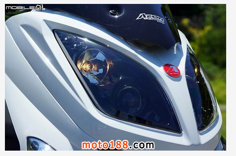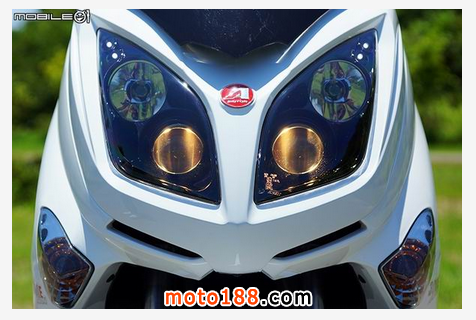 一樣從車頭開始看起,這次 Elite 300E 采用燻黑雙大燈組,大燈為遠近燈獨立燈組,上方則是法國 ERMAX 的長風鏡,對于高速風壓阻擋有實質加分效果,而在車頭斜角處則是方向燈組。