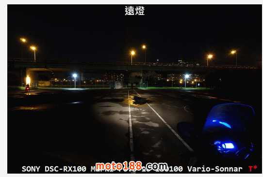 大燈照射角度實際拍攝,亮度透過相機設定,調整至與最接近人眼現場觀看的亮度來做比較;這組燈具雖然就外觀以及配置而言都與同廠 3D-350 相似,但打出來的燈型不知為何卻比較好一些,以近燈來說,廣度適中,亮度也集中,對于市區通勤族應該夠用了,遠燈方面也是讓人眼睛為之一亮,雖然使用較為集中的遠燈燈型,但路底能夠清楚照出來,偶爾進行山區夜間騎乘也算不錯羅。