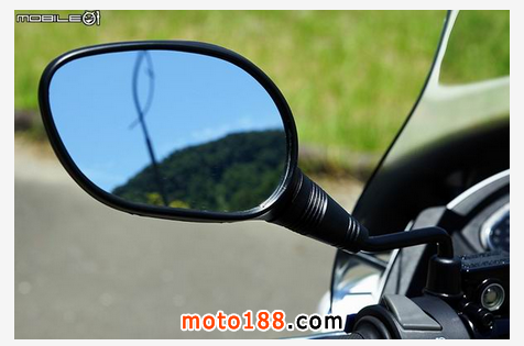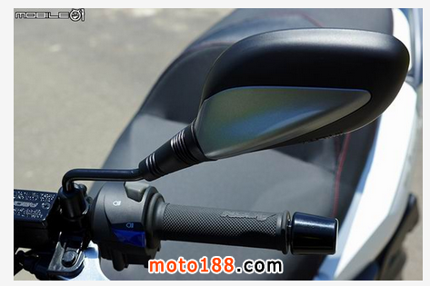 后照鏡正面及背面部分,采用外調式后照鏡,鏡骨角度較為奇特一些,估計是為了讓后照鏡能閃過肩膀,才能看清后方,不過這樣的鏡骨也會稍微干涉到把手開關按鈕操作就是。