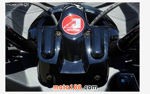 把手上蓋部分,采用裸露把手加上類似檔車之固定方式,另外再鎖上一塊塑膠蓋來遮蔽底下的真實把手橫桿鎖點,塑膠蓋上則有 AEON 宏佳騰機車的立體廠徽。