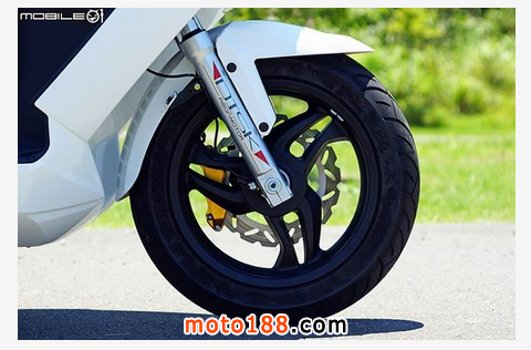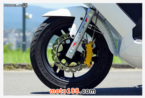 前叉采用 35mm 正立式前叉,搭配前 14 寸輪組以及 Elite 300 車系的大型對向六活塞輻射卡鉗,以及 265mm 煞車碟盤,支撐性及制動能力讓人驚訝。