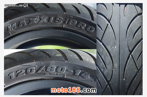 前輪為 MAXXIS 生產的 iPro 系列輪胎,規格為 120/80-14,胎紋可以參考右側,這條輪胎在許多大羊車款都做為原廠配胎,抓地力還不錯,但耐用度差強人意。