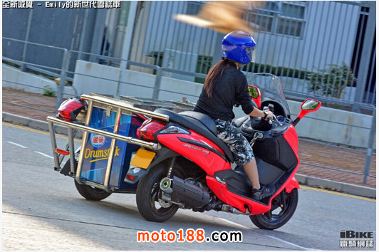 前事講完,是時候講講Emily和她的Joymax 300i雪榚車。Emily實際駕駛電單車的時間只有一年經驗,對電單車的認識不算深。所以當她獲得冰凍甜點流動小販牌照后,便要靠牛奶飲品食品業職工會的幫忙,才能建造屬于她的雪榚電單車,和學習入貨和營運的知識和流程。Emily表示除了要多謝工會的幫忙之外,還要感謝SYM代理奧士車行的車經理,在買車和改裝的過程中,提供專業協助和建議。