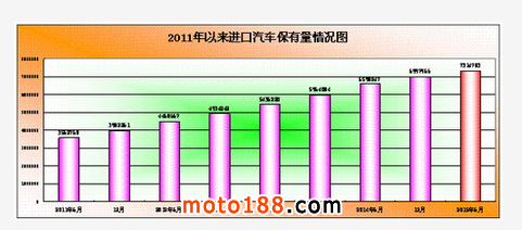 截至6月底,全國進(jìn)口機(jī)動(dòng)車保有量為7344378輛。其中,進(jìn)口汽車保有量7314783輛,與2014年底相比增加316817輛,增長4.53%。與去年同期相比,增加716736輛,增長10.86%,進(jìn)口汽車占進(jìn)口機(jī)動(dòng)車總量的99.6%,比去年同期提高0.01個(gè)百分點(diǎn)。進(jìn)口摩托車保有量為28487輛,比2014年底增加4764輛,比去年同期增加1917輛。從統(tǒng)計(jì)情況看,2011年以來進(jìn)口汽車特別是進(jìn)口小型載客汽車保有量呈快速增長趨勢,進(jìn)口汽車保有量占汽車保有量的比例達(dá)4.49%,比2011年底提高0.72個(gè)百分點(diǎn)。