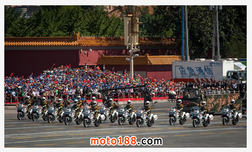 2015年9月3日,我國(guó)舉行了盛大的、以“中國(guó)人民抗戰(zhàn)勝利暨世界反法西斯戰(zhàn)爭(zhēng)勝利70周年”為主題的閱兵儀式。去年底恢復(fù)使用的摩托車禮賓護(hù)衛(wèi)方隊(duì)是此次抗戰(zhàn)閱兵的重頭戲之一。由45輛國(guó)賓摩托車組成的方隊(duì)呈箭頭狀護(hù)衛(wèi)抗戰(zhàn)老同志方隊(duì)乘坐的敞篷車進(jìn)場(chǎng),在分列式中第一個(gè)通過天安門,備受矚目。