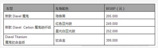 杜卡迪中國也在車展期間公布了最新 2015 款 Diavel 魔鬼車系的官方指導價: