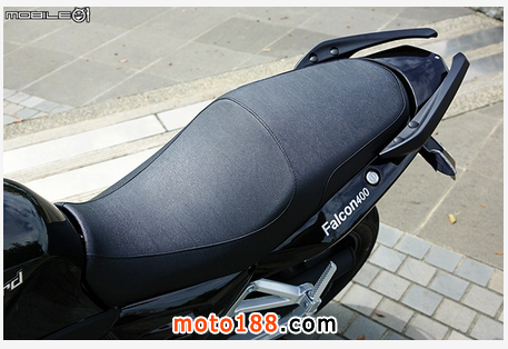 Falcon 400 的坐墊采用前后一體坐墊,與大部分目前新款市售街跑車不太相同,一體式坐墊的外觀雖然沒有前后分離坐墊如此帥氣,但相對來說不論前座或者后座都能有較舒適的乘坐感受,另外哈特佛在皮面方面也有使用沒這么黏的止滑材質(zhì),比起全止滑材質(zhì)會更舒適一點。