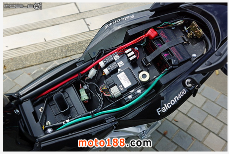 坐墊打開后,底下這些元件就是 Falcon 400 的電控系統(tǒng)以及空濾進氣口、電瓶等位置,至于坐墊打開后是否有置物空間...老實說,這些小空間要說能塞輕便雨衣等當然沒問題,但這個說法還是太牽強,而且電控系統(tǒng)全都在這,實在不建議在這底下狹小的空間還放置物品壓迫電線,要置物空間還是另外安裝后車箱或者掛上軟式側(cè)包吧!