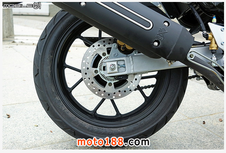 后輪碟盤采用 240mm 的固定碟盤,卡鉗則是單向雙活塞浮動式卡鉗,在碟盤中間有著一格一格的部分,這部分是時速表顯示用的霍爾效應傳感器,并不是仿間俗稱的 ABS 感應器,因為有這片不代表一定就有 ABS,有 ABS 的車款也不一定會看到這片感應盤及感應器,所以要判別還是以官方說明為準,別再被誤導了羅。