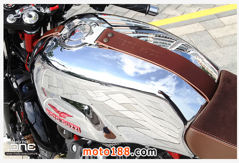 ●電鍍油缸上面配置精緻烙而有MOTO GUZZ 字款的皮帶。