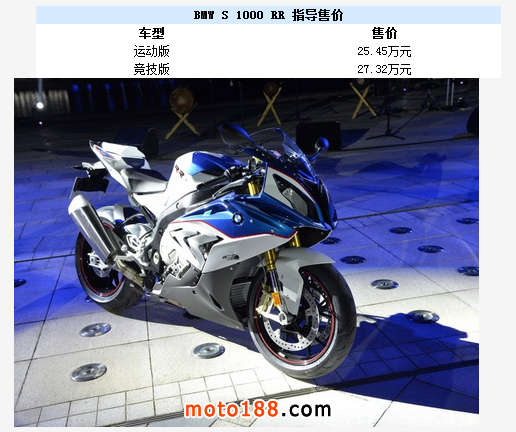 此次發(fā)布的BMW S 1000 RR摩托車共有2款車型,官方建議零售價(jià)為運(yùn)動(dòng)版為25.45萬(wàn)元;競(jìng)技版為27.32萬(wàn)元。