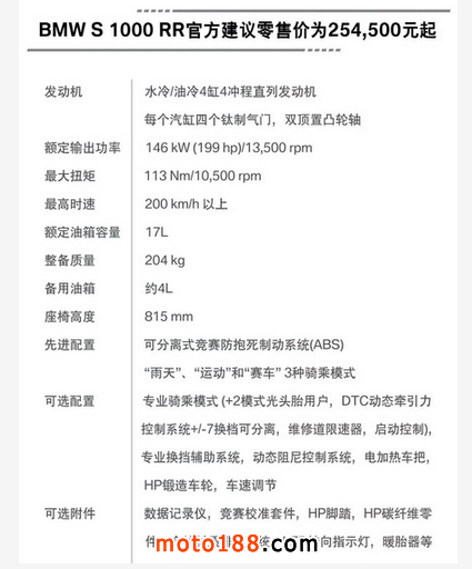 此次發布的BMW S 1000 RR共2款車型,官方建議零售價為運動版RMB 254,500;競技版RMB 273,200元。