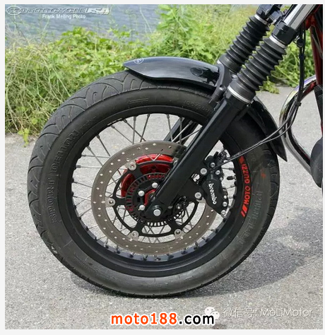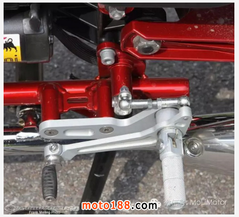 跟同一集團的Aprilia 賽車來相比來說, 配置鋼骨車架,還有后面不可調的復古bitubo避震器,好像顯得略遜一籌, 唯一現代化的是鋁合金后搖臂, 但話說回來,哪一臺復古車不是這樣的設計? 但可以從我穿得軍靴前面摩擦的痕跡可以期待他的彎道樂趣是有的,如果你敢壓車的話!