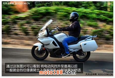值得一提的是,創新設計的“電動無極可調擋風”更是為愜意的摩托車旅行錦上添花,可以滿足不同身高人群和不同行駛狀態下的需要。不僅可實現100毫米范圍內的任意位置調整,還具有位置記憶功能,這一功能只有在國外高端品牌的頂級旅行車上才會出現。