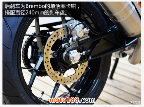 在懸架及剎車(chē)配置方面,690 Duke是這次海選中配置最高的車(chē)型。43mm的倒立式前叉(不可調(diào)),是減震器大廠WP的產(chǎn)品。前剎車(chē)雖然是直徑320mm單盤(pán)剎車(chē),但是使用了Brembo的對(duì)四剎車(chē)卡鉗,剎車(chē)盤(pán)是浮動(dòng)式設(shè)計(jì),比起200/390 Duke要來(lái)的更有誠(chéng)意,而且反應(yīng)也靈敏許多。很多人或許會(huì)質(zhì)疑排量已經(jīng)到達(dá)690ml,為什么不配置雙碟?這是因?yàn)檐?chē)重不是很重,所以單盤(pán)配置足以應(yīng)付這輛車(chē)的動(dòng)力。