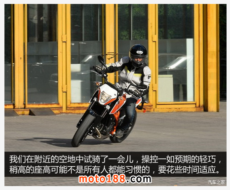 至于操控性,它騎起來(lái)不太像是騎著一輛大排量摩托車(chē)。輕量化是這輛車(chē)的最大優(yōu)勢(shì),它的鋼管車(chē)架只有9kg重而已,鋁合金后擺臂只有4kg,看得出來(lái)KTM對(duì)于車(chē)重的控制非常有一套。而單缸發(fā)動(dòng)機(jī)體積較小,曲軸長(zhǎng)度較短,所以發(fā)動(dòng)機(jī)運(yùn)轉(zhuǎn)的慣性也比較小,所以在傾倒車(chē)身準(zhǔn)備過(guò)彎的時(shí)候,你會(huì)覺(jué)得車(chē)身動(dòng)態(tài)非常的自然迅速,沒(méi)有什么費(fèi)勁的地方。