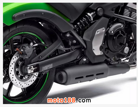 VULCAN S的底盤設(shè)置,同樣反叛了美式巡航的傳統(tǒng),放棄了鋼管搖籃式車架,改為采用VERSYS 650的結(jié)構(gòu),在用高拉力鋼管和鋁合金側(cè)板緊緊擁抱直列雙缸的同時(shí),還用鋼管從氣缸兩側(cè)圍住發(fā)動(dòng)機(jī),顯得異常緊湊。采取接近水平右側(cè)安裝的單筒減震器,同樣借鑒了VERSYS 650的結(jié)構(gòu),行程為80 mm,彈簧預(yù)載7階可調(diào);前叉則是41mm正立式前叉,提供130mm的行程。此外,排氣系統(tǒng)也與傳統(tǒng)巡航車不一樣,采用了短湊直管,并且安裝在發(fā)動(dòng)機(jī)之下,此舉有利于降低整車重心,提高質(zhì)量集中化程度。