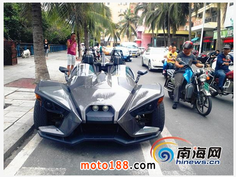 隨后,記者通過網(wǎng)上與照片比對,發(fā)現(xiàn)三亞出現(xiàn)的奇異車輛為“北極星”摩托跑車——Polaris Slingshot三輪跑,該車由美國雪地摩托及全地形車制造商--北極星(Polaris Industries)于2014年9月份上市推出,在美國起價23,999美元(約合人民幣14.8萬元)。有網(wǎng)友稱,在我國普通版售價約31萬元,高檔版約40余萬元。
