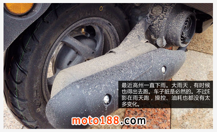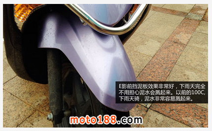 E影前擋泥板效果非常好,下雨天完全不用擔(dān)心泥水會(huì)濺起來。以前的100C,下雨天騎,泥水非常容易濺起來。