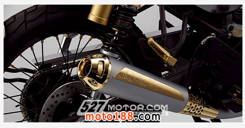 Resonator 125搭載125c.c.風冷四沖程發動機,而該車最大的亮點在于它與樂器制作相結合的設計。如新車油箱兩側采用了制作鋼琴用的原木;經過精心設計的油箱蓋則采用了制作銅管樂器的黃銅材質;排氣管和油箱蓋上繁復花紋的雕刻技術則是只有在銅管樂器上才會采用的。這些樂器材質和技術的運用使該車看起來既復古又時尚,而新車在車把處留有固定手機的位置,又為它添了幾分現代氣息。