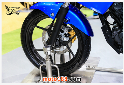 前煞車是單碟, 配上單向雙活塞卡鉗與固定式碟盤