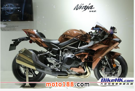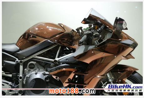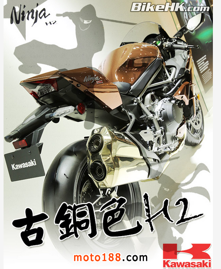 Kawasaki的H2除了那臺(tái)超級(jí)增壓引擎之外,銀鏡處理的擾流就成為了它的象徵。大家都見識(shí)過暗黑色的H2鏡面啡呤,在東京車展內(nèi)Kawasaki特別展出了一臺(tái)古銅色鏡面H2,全套擾流仍然用鏡面處理,但卻混入了古銅色。在撇開綠色之外,原來也可以很好看!