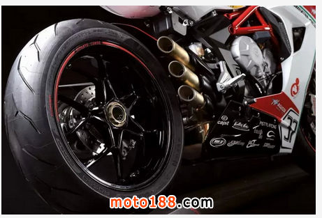 F3 800 RC擁有純正的賽車血統,不僅采用了奧古斯塔WSS賽車的貼花,而且配有賽車手克魯澤爾和扎內蒂的聯合簽名,腳蹬用上了Ergal產品,離合器桿、前剎車桿具有防折斷的接頭……當然,對于這臺風格和性能兼備的意大利跑車,想要物美價廉是不可能的。限量發行250臺的F3 800 RC,售價高達19250美元,比最新版雅馬哈YZF-R1還貴2000多美元;限量發行100臺的F3 675 RC略便宜些,但同樣貴過了YZF-R1。