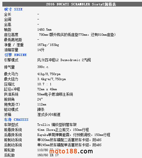 而新款SCRAMBLER Sixty2(62)的意思,是紀念第一代SCRAMBLER在1962年誕生的日子。雖然驟眼看Sixty2的外型與803cc大排版分別不大,但排氣 管佈局、尾擔結構及前叉等等仍有很大分別。為了照顧入門騎士的需要,新設計的L2引擎特性偏向柔順的馬力輸出,相信闊轪把及低矮的座高跟大排版同樣舒適。 正如DUCATI高層透過新車發佈會表示,Sixty2是最經濟的DUCATI,可讓年青騎士可透過她逐步認識DUCATI。