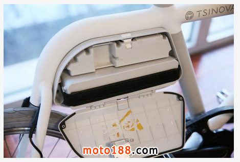 下面就是這輛車的核心技術,電動助力機上有一個電池組,由它為發電機供電。電池非常的小巧輕便,對于女孩子來講也可以非常輕松的拆卸。