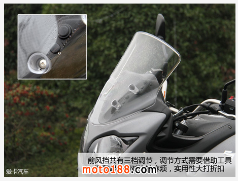安全方面,前制動為2x310mm雙活塞卡鉗,后260mm單活塞卡鉗,標配ABS防抱死剎車系統。油箱容積20公升,正常騎行狀態下,可以達到400公里以上續航里程。3擋可調節風擋,能夠減少騎士在騎行中的風阻,緩解疲勞。835mm的座位高度和214kg的車輛自重對于1.7米以上有經驗的騎士來說毫無難度,只是原地挪放車輛時顯得不夠從容。