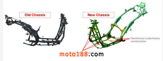 除了引擎動(dòng)力和外觀, 車架也進(jìn)行了強(qiáng)化。與舊款G-DINK相比, 新款G-DINK在車頭前端采用較粗的鋼管,并在車身中央增加加強(qiáng)肋, 使得車身的抗扭轉(zhuǎn)能力更好