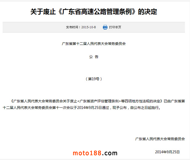 因與國(guó)家相關(guān)法規(guī)沖突,廣東省禁止摩托車上高速的地方條例《廣東省高速公路管理?xiàng)l例》已于2014年9月25日被廣東省人大廢止,現(xiàn)在廣東省摩托車在高速行駛按《中華人民共和國(guó)道路交通安全法實(shí)施條例》相關(guān)規(guī)定執(zhí)行