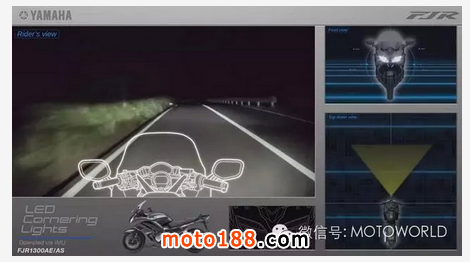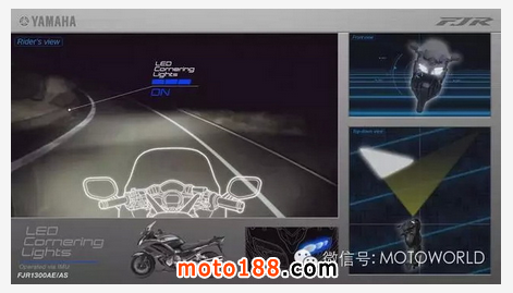 隨著最新款摩托車紛紛配備LED車燈,LED的特性也衍生出了新問題,光束照射產生的暈染效果較差,中間亮度過高,使夜間死角顯得更加昏暗(說白了就是光束太集中),YAMAHA在新一代FJR1300身上運用新科技解決此問題,在可預見的未來,轉向頭燈即可能成為各廠高規車款的標配項目之一。