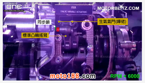 ●低於6,000rpm時,即低及中轉使用標準凸輪搖臂及標準凸輪開啟生氣氣門。