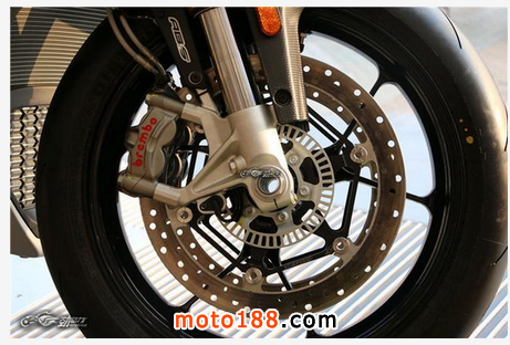 前制動采用直徑為320毫米的雙浮動式鉆孔盤配Brembo M430直栓式對向4活塞卡鉗,后制動采用直徑為220毫米的單制動盤配Brembo對向雙活塞卡鉗。配備了可關閉的Bosch 9MP ABS制動防抱死系統,帶有3種調節模式,并可抑制后輪離地。