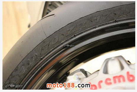 RSV4 RR使用了新一代的倍耐力 DIABLO SuperCorsa SP輪胎,這款輪胎也是眾多超級跑車的首選之一。前輪胎規格為120/70 ZR 17,后輪胎規格為200/55 ZR 17。