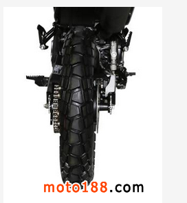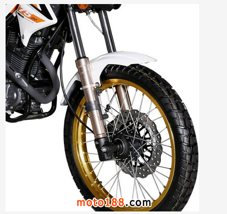 另一個明顯的變化是車輪部分,原本的鋼圈換成了重量更輕的金色陽極氧化鋁圈,視覺效果大幅提升。輪胎換成了前90后120的公路越野兩用胎,胎齒更深,在非鋪裝路面上的抓地力更強。