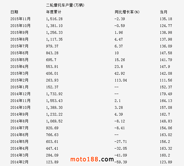 2015年11月我國二輪摩托車產量為135.18萬輛,同比下降2.39%。