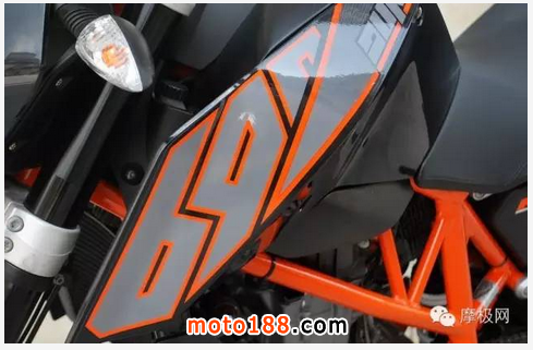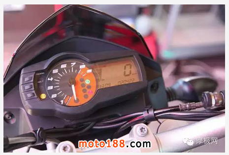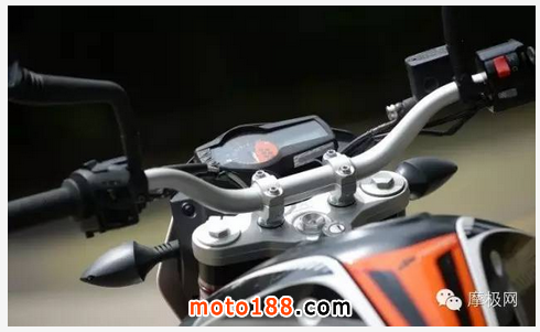 精簡的數碼儀表搭配上指針轉速與多燈號顯示器的組合,可以說是“麻雀雖小,五臟俱全”,儀表上方也少了過去街車常見的車頭整流罩或者小風鏡,在大太陽下判讀可能要稍稍閃避強烈的反射光線了。裸露的車手把,中間刻印上KTM的字樣,帶有噴砂質感的車手把相當地有質感。與前叉配色選用相同的涂裝,手把上方有刻度環,可以提供騎士做細節上的調整車手把角度。把手材質采用鋁合金的材質,KTM Duke 690選擇Magura的異徑把手,在強度與手感上都能兼顧,同時把手轉向角度高達63.5度,這對于許多街跑車來說是夢寐以求的角度,也因此大大增加了Duke 690的靈活性。