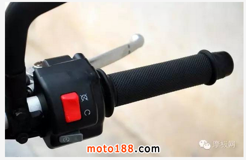 右側把手開關,主要的引擎熄火開關跟下方的電發開關,塑料的材質搭配黑色烤漆,簡單明了。握把采用顆粒的防滑握把,抓握起來軟硬適中,不會有過硬或者偏軟容易磨耗的問題。