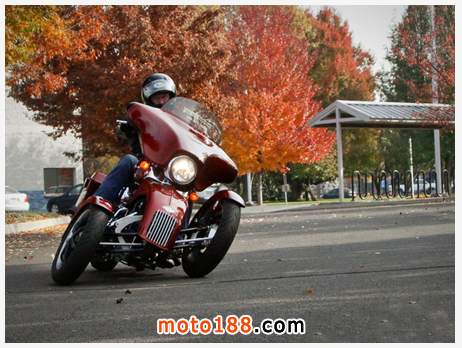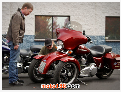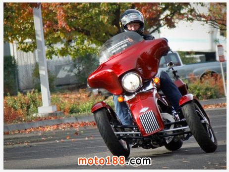 Mighell的做法是,發明了一個獨特的兩輪轉換裝置,據稱,該裝置目前已經適用于哈雷其他幾款旅行車和本田的金翼等。兩輪轉向為聯動可傾斜,制動方面用的是13英寸的盤式液壓制動。