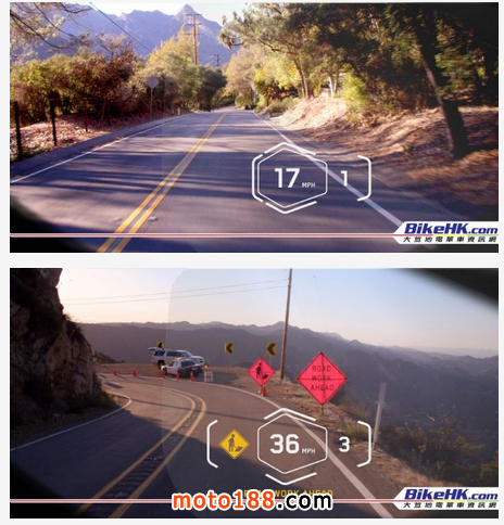 若然加入未來(lái)V2V (vehicle-to-vehicle)車對(duì)車溝通技術(shù),系統(tǒng)甚至可以顯示即時(shí)路況,以及即時(shí)的危險(xiǎn)警告。而系統(tǒng)亦著重令騎士感到舒適,例如在旅程開(kāi)始前提供導(dǎo)航建議。然而HUD系統(tǒng)亦可以帶來(lái)更多乘騎樂(lè)趣,例如頭盔會(huì)添加向前的運(yùn)動(dòng)攝影鏡頭,令騎士可以為旅程錄影。而後置鏡頭亦可以令頭盔的HUD系統(tǒng)成為電子後鏡。系統(tǒng)更可以提供車友位置資訊,那就少下了利用walkie talkie大呼小叫找車友了。