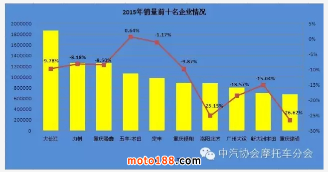 2015名銷量前十名企業(yè)分別是大長江、力帆、隆鑫、五羊本田、宗申、銀翔、洛北方、大運、新大洲本田、重慶建設(shè)。銷量前十名企業(yè)中僅五羊本田呈現(xiàn)微幅上漲,其他企業(yè)呈現(xiàn)不同程度下降,個別企業(yè)降幅超過了25%。