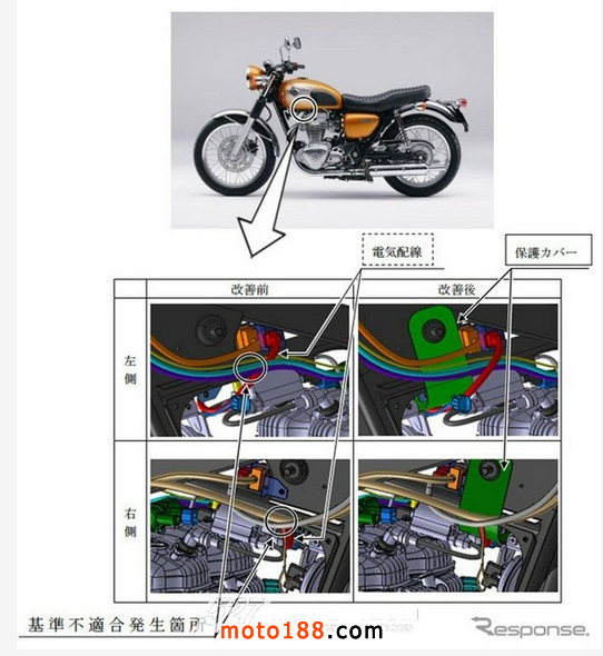 川崎W800存在的兩個問題都會導致發動機運轉異常,一個是因電線安裝不當,可能會使電線卡在油箱與車架的縫隙中,造成電線損壞,如果裸線與油箱接觸會引起短路,進而導致發動機停滯。為此,川崎經銷商將為車主加裝電線防護罩,并重新安排電線的位置。