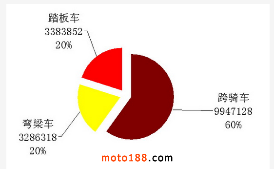 分類車型統計中,跨騎車、彎梁車下降幅度均超過10%,踏板車則獲得0.35%的微增長。同時,踏板車也首度超過彎梁車,成了第二大占比車型。