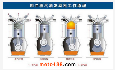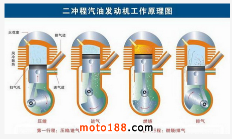 首先,要給小白們普及一下何為2沖程,何為4沖程。先說(shuō)說(shuō)當(dāng)今得到普遍應(yīng)用的4沖程發(fā)動(dòng)機(jī)。發(fā)動(dòng)機(jī)是由氣缸、活塞、連桿、曲軸、飛輪等部件組成的,油氣混合氣在氣缸與活塞組成的空間內(nèi)進(jìn)行燃燒做功,活塞的往復(fù)運(yùn)動(dòng)叫做沖程。在4沖程發(fā)動(dòng)機(jī)中,它的4個(gè)沖程分別為:進(jìn)氣沖程(活塞下行)、壓縮沖程(活塞上行),膨脹做功沖程(即點(diǎn)火燃油燃燒,活塞下行)和排氣沖程(活塞上行)。之后周而復(fù)始做往復(fù)運(yùn)動(dòng),在這4個(gè)沖程來(lái)看,活塞兩上兩下過(guò)程中只有第三沖程是輸出動(dòng)力的,所以4沖程發(fā)動(dòng)機(jī)可以看作曲柄轉(zhuǎn)兩圈,發(fā)動(dòng)機(jī)燃燒做功一次。