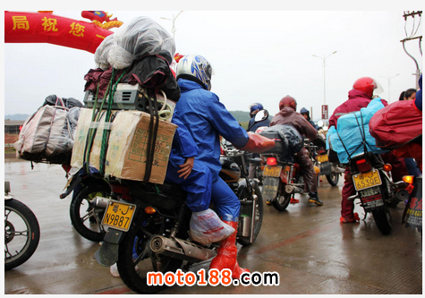 核心提示: 1月26日,廣西梧州市出現(xiàn)寒潮陰雨天氣,氣溫降至6℃左右,寒風(fēng)刺骨,眾多返鄉(xiāng)鐵騎大軍披著雨衣,穿著水鞋在寒風(fēng)冷雨騎行。他